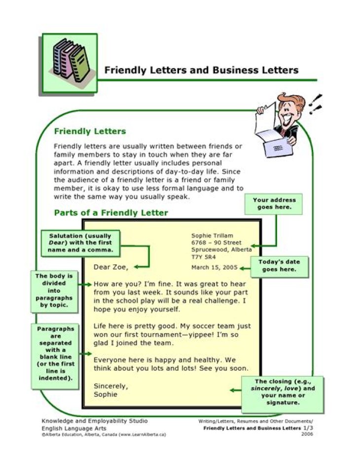This handout outlines the 5 parts of a friendly letter – Heading, Greeting, Body, Closing and Signature.