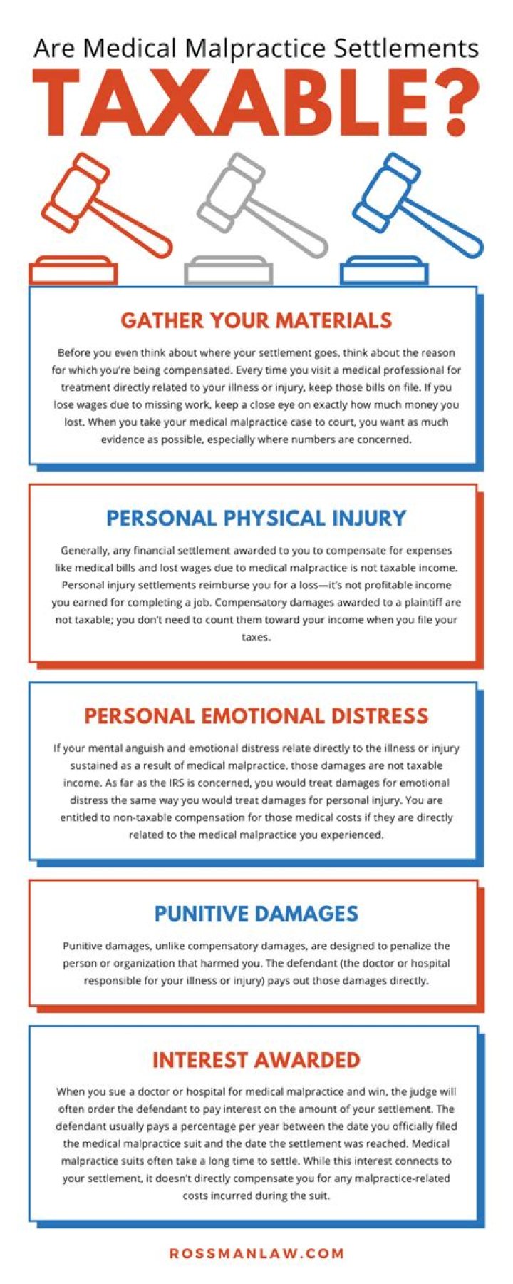 When it comes to medical malpractice settlements, the Internal Revenue Service (IRS) classifies these as “personal physical injuries” or “physical sickness” settlements. In general, any compensation you receive in a settlement or jury verdict will not be taxable by the IRS.