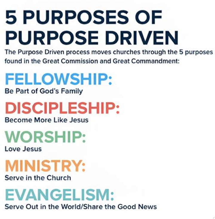 Warren suggests that these purposes are worship, fellowship, discipleship, ministry, and mission, and that they are derived from the Great Commandment (Matthew 22:37–40) and the Great Commission (Matthew 28:19–20). Warren writes that every church is driven by something.